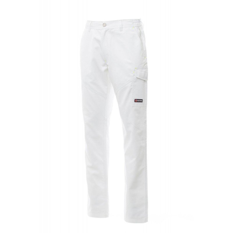 Ganzjährig tragbare Unisex-Hose, seitlich dehnbarer Bund und Gürtelschlaufen, Hosenschlitz mit Reißverschluss und Knopf aus Kunststoff, 2 klassisch geschnittene Vordertaschen, 1 Seitentasche mit LOCK SYSTEM, 1 Zollstocktasche, 1 offene Gesäßtasche und 1 mit Patte und Klettverschluss, Nähte Ton-in-Ton, Reflexstreifen auf der Gesäßtasche, Dreifachnähte. Nietknopf bei Ausführung in Weiß.