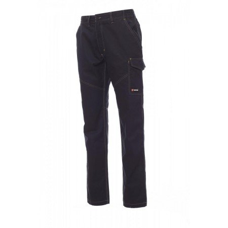 Ganzjährig tragbare Herrenhose mit Kniepolstertaschen aus Cordura, seitlich dehnbarem Bund und Gürtelschlaufen, Hosenschlitz mit Metallreißverschluss und -knopf, zwei Vordertaschen mit Innenseite aus dem Stoff der Hose, zwei multifunktionalen Seitentaschen mit abtrennbarem und verschließbarem Ausweisfach, einer Reißverschlusstasche, zwei offenen Gesäßtaschen, Hammerhalter, Einsätzen und Nähten in Kontrastfarbe, Dreifachnähten am Innen und Außenbein.