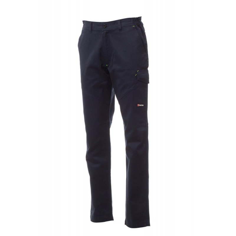 Ganzjährig tragbare Herrenhose mit Kniepolstertaschen aus Cordura, seitlich dehnbarem Bund und Gürtelschlaufen, Hosenschlitz mit Metallreißverschluss und -knopf, zwei Vordertaschen mit Innenseite aus dem Stoff der Hose, zwei multifunktionalen Seitentaschen mit abtrennbarem und verschließbarem Ausweisfach, einer Reißverschlusstasche, zwei offenen Gesäßtaschen, Hammerhalter, Einsätzen und Nähten in Kontrastfarbe, Dreifachnähten am Innen und Außenbein.