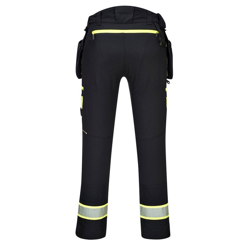 Die DX4 Hose mit abnehmbarem Warnschutz-Holster ist ergonomisch gestaltet und nutzt die gezielte Platzierung von dynamischen 4X-Stretch-Geweben, um maximale Bewegungsfreiheit beim Arbeiten zu gewährleisten. Die Hose verfügt über einen hochgezogenen Rückenbund mit seitlichem Gummizug, der Schutz in allen Arbeitspositionen gewährleistet. Vorgeformte, von oben zu bestückende, verstellbare Kniepolstertaschen, großzügig bemessene Fronttaschen und multifunktionale Oberschenkeltaschen mit Reißverschluss bieten sicheren Stauraum. Dreifachnähte im gesamten Bereich für maximale Haltbarkeit.