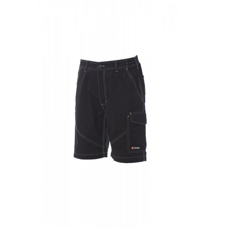 Herren-Bermudas, seitlich dehnbarer Bund und Gürtelschlaufen, Hosenschlitz mit Reißverschluss und Knopf aus Kunststoff, 2 klassisch geschnittene Vordertaschen, 1 Seitentasche mit LOCK SYSTEM, 1 Zollstocktasche, 1 offene Gesäßtasche und 1 mit Patte und Klettverschluss, Einsätze und Nähte in Kontrastfarbe, Reflexstreifen auf der Gesäßtasche, Dreifachnähte.