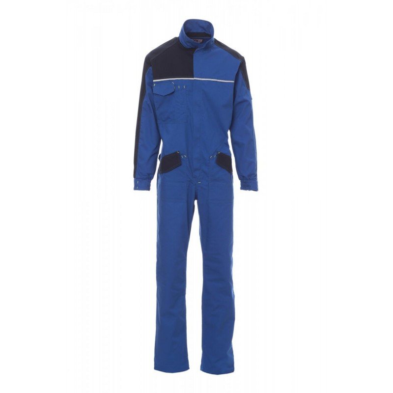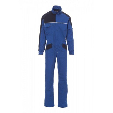 Zweifarbiger Arbeitsoverall mit Reißverschluss, elastischen Ärmelbündchen mit Knopf, zwei Vordertaschen mit LOCK SYSTEM und verstärktem Taschenboden, einer großen multifunktionalen Brusttasche, Smartphone-Tasche und Einsteckfach für den Ausweis, einer Gesäßtasche mit Patte und einer mit zwei Reflexstreifen, Reflexpaspelierung auf Brust und Hüfte, Gummizug auf Hüfthöhe und Doppelfalte auf dem Rücken für mehr Bewegungsfreiheit.