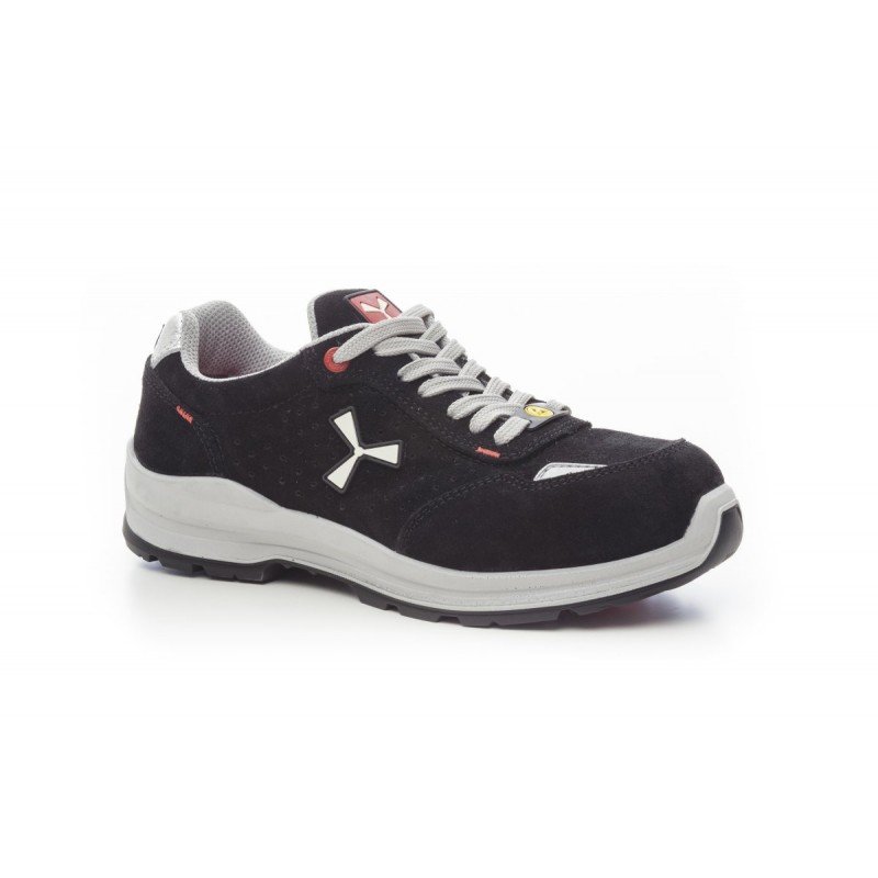 Niedriger antistatischer Herren-Sicherheitsschuh, Obermaterial aus wasserabweisendem Spaltleder mit atmungsaktiven Einsätzen aus technischem Stoff, atmungsaktives und abriebfestes Innenfutter (auf der gesamten Innenfläche), 6+6 metallfreie Ösen, reflektierender Einsatz an der Hinterkappe, Zehenschutzkappe aus druckgegossenem Aluminium, herausnehmbare Einlage Ortholite X40 016, zertifizierte durchtrittsichere Sohle aus Verbundgewebe, Versteifungselement zum Schutz vor Verdrehungen, hufeisenförmiger Spitzenschutz, Zwischensohle aus federleichtem Polyurethan, Dämpfungssystem MASTER BALANCE aus PU-Polyether von hoher Bruchfestigkeit und ausgewogener Dichte, X-TRAIL-GRIP-Sohle aus TPU mit Fersen- und Zehenschutz.