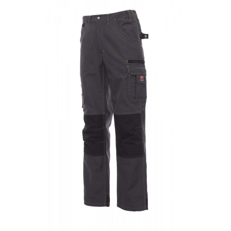 Ganzjährig tragbare Herrenhose mit Kniepolstertaschen aus Cordura, seitlich dehnbarem Bund und Gürtelschlaufen, Hosenschlitz mit Metallreißverschluss und -knopf, zwei Vordertaschen mit Innenseite aus dem Stoff der Hose, zwei multifunktionalen Seitentaschen mit abtrennbarem und verschließbarem Ausweisfach, einer Reißverschlusstasche, zwei offenen Gesäßtaschen, Hammerhalter, Einsätzen und Nähten in Kontrastfarbe, Dreifachnähten am Innen und Außenbein.