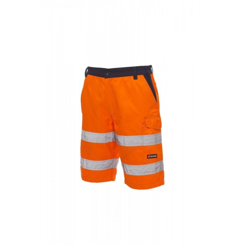 Herren-Bermudas, Reflexstreifen als Warnschutz, seitlich dehnbarer Bund und Gürtelschlaufen, Hosenschlitz mit Reißverschluss und Knopf aus Kunststoff, 2 klassisch geschnittene Vordertaschen, 1 Seitentasche mit LOCK SYSTEM, 1 Zollstocktasche, 1 offene Gesäßtasche und 1 mit Patte und Klettverschluss, Dreifachnähte im Schritt und am Innenbein.